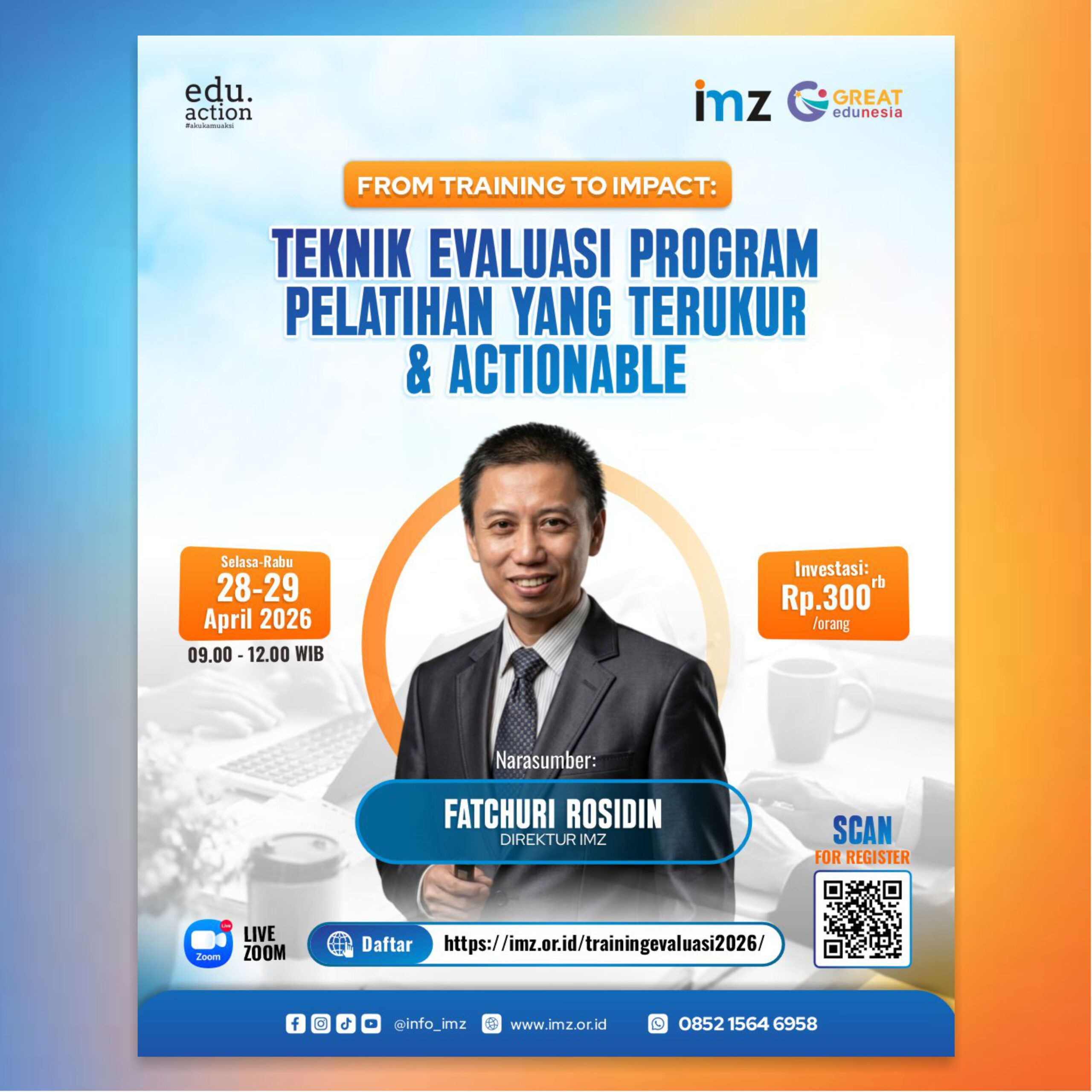 Program ini sangat direkomendasikan untuk tim HR, Learning & Development, dan trainer internal, agar mampu membangun evaluasi training yang terukur hingga level implementasi dan ROI.